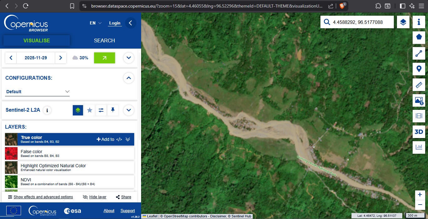 To obtain the “after” view, I pasted the same coordinates into the Copernicus Browser and checked the most recent Sentinel imagery available for the area.