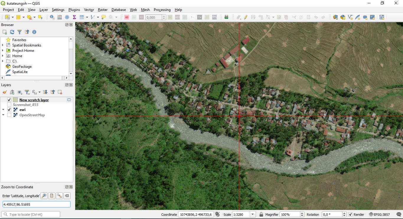 I copied the coordinates from Google Maps (right click) and moved into QGIS, loaded the ESRI satellite imagery basemap, and examined the area.