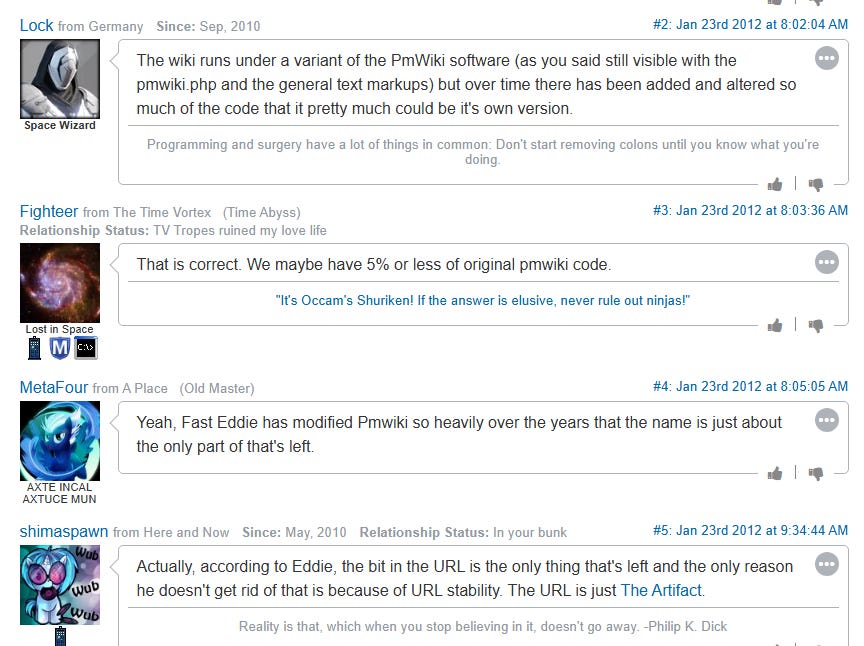 Back then, I abandoned PmWiki because it was too complex to use. There are plenty of cryptic things that you have to do in order to achieve even the simplest functionality. There’s no simple button. You need to know the “hacks” for its basic functionality. Using PmWiki is a constant battle of Google searching, looking up tutorials and documentation on how to do this and that.