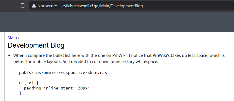 }I also decided that I needed more space for text. There was too much unused whitespace in the desktop view, so I modified the #wikitext max-width from 750px to 800px.