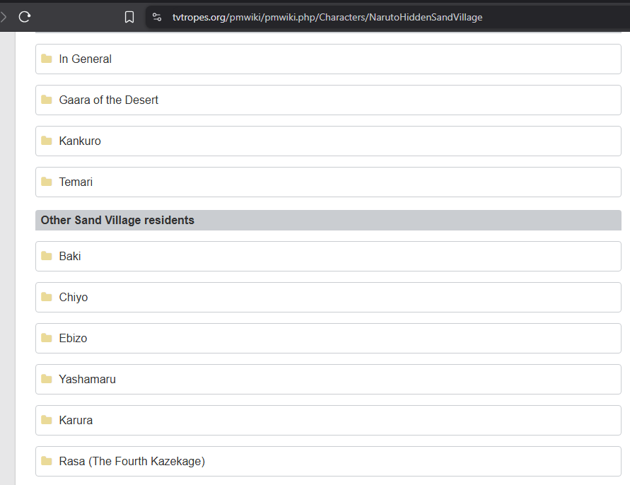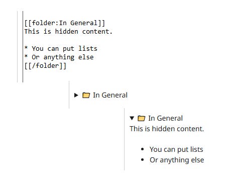TvTropes sometimes has very long pages. To mitigate this, they implemented a “folder” feature to group and collapse parts of the content. This functionality is not built into PmWiki.