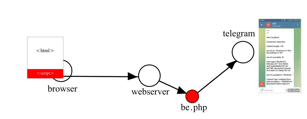 File html dari webserver sampai di browser pengguna. Browser akan menampilkan file html itu, sekaligus mengeksekusi script javascript rt-analytics yang sudah kita sisipkan sebelumnya. Script ini akan mengirim sinyal balik ke webserver, lalu diproses backend be.php. Backend akan mengirim pesan ke bot telegram, bahwa saat ini, web kita sedang dikunjungi seseorang. Detil lengkap mengenai pengunjung web kita akan ditampilkan langsung dalam bentuk chat telegram.