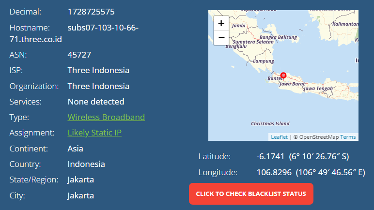 IP pengunjung dapat dicek lebih lanjut menggunakan whatismyipaddress.com untuk mendapatkan perkiraan lokasi fisik dan isp pengguna.