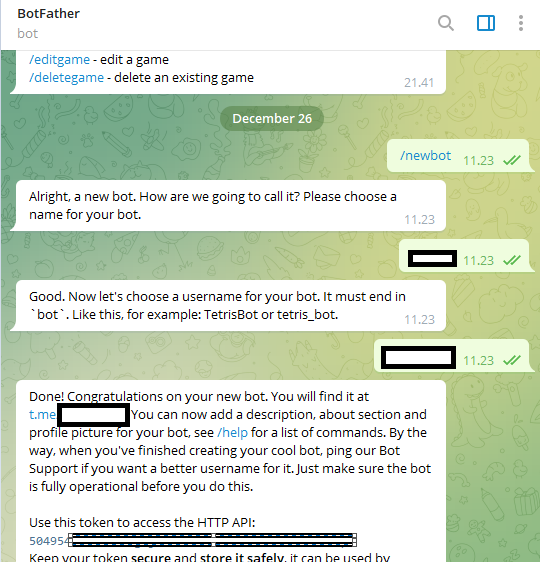 Buat bot Telegram baru menggunakan BotFather (https://t.me/botfather)