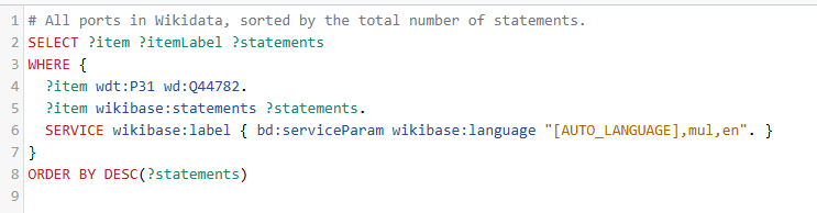 First, I made a SPARQL query to get all Wikidata items that have an “instance of: port” statement, then sorted them based on how many statements each item had.