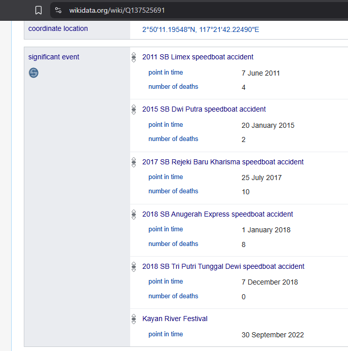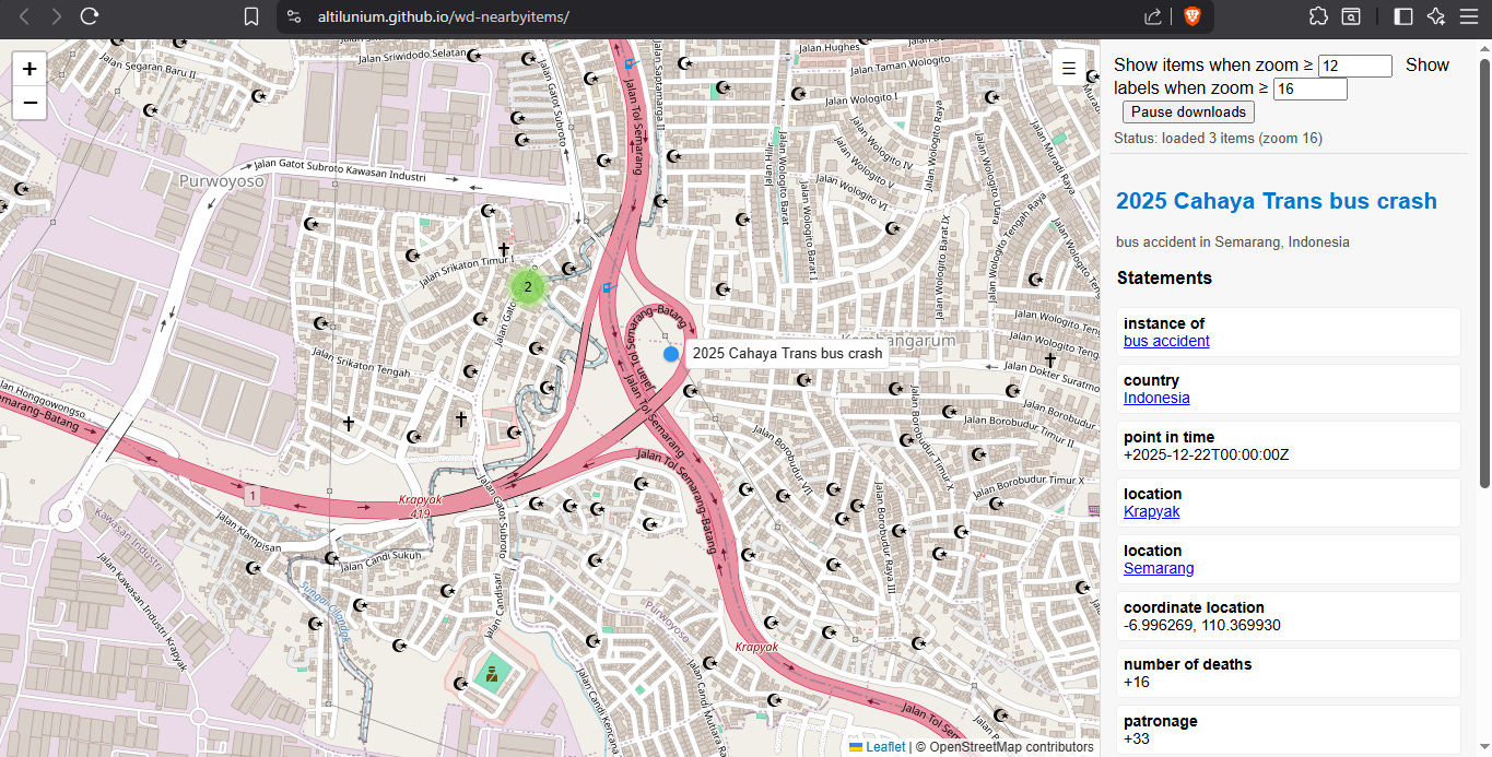The next day, there was a bus accident in Semarang with many casualties. Based on available news coverage, I tried to construct a Wikidata model item for an “accident event.”